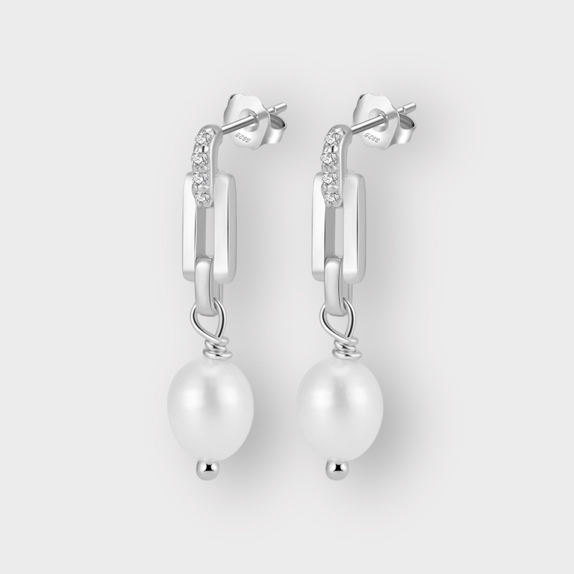 A modern rectangular hoop paired with a delicate freshwater pearl drop. Feminine yet architectural, these earrings bring balance between softness and structure—perfect for both day-to-day elegance and evening refinement.