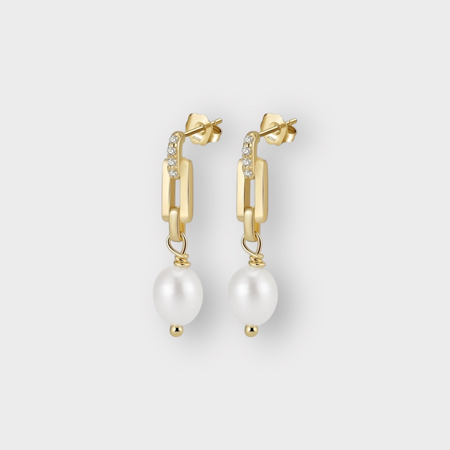 A modern rectangular hoop paired with a delicate freshwater pearl drop. Feminine yet architectural, these earrings bring balance between softness and structure—perfect for both day-to-day elegance and evening refinement.